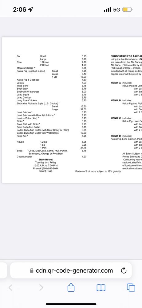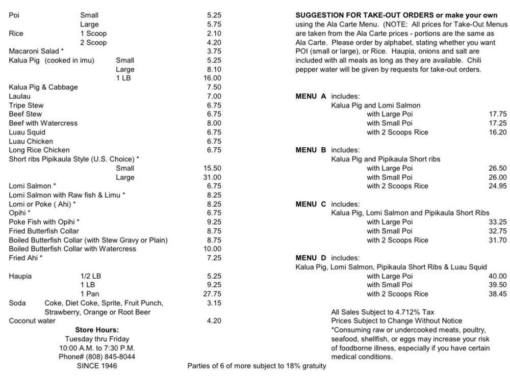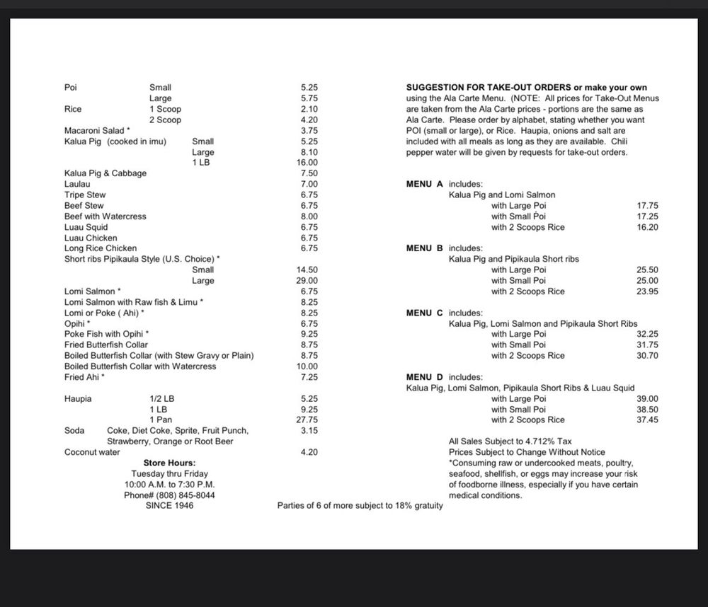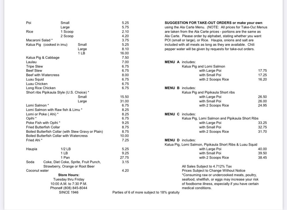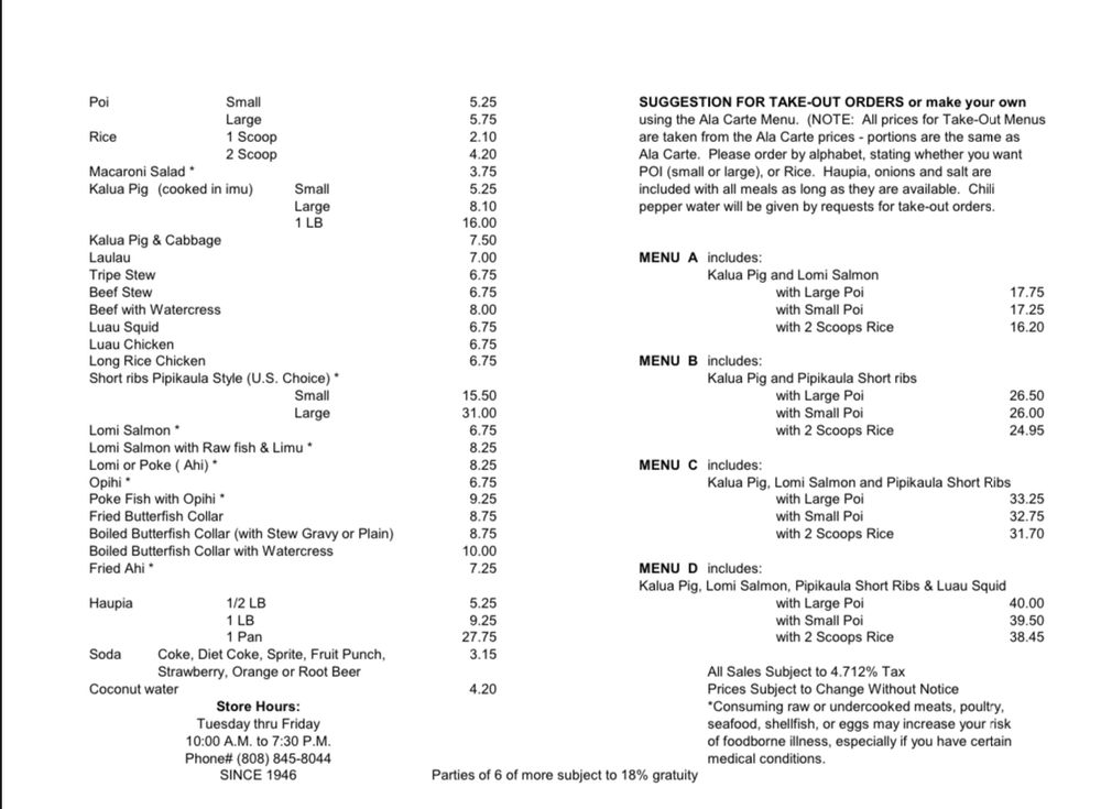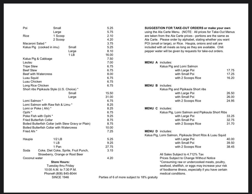 Helena's Hawaiian offers an authentic taste of traditional Hawaiian cuisine in a casual setting. Located in Honolulu, this restaurant provides a comprehensive dining experience with a variety of dishes such as Kalua Pig, Pipikaula Short Ribs, Lomi Salmon, and Laulau. Customers have praised the flavorful Short Ribs Pipikaula style, tender Kalua Pig, and the surprisingly good Luau Squid. The service radiates aloha spirit, making diners feel at home. Despite limited parking and small portions, the food quality shines through. Dishes like the Fried Ahi and Macaroni Salad are must-tries. Helena's Hawaiian is a treasure trove of delicious Hawaiian flavors that leave a lasting impression on anyone's taste buds. It's a place where the magic of Hawaiian cuisine truly comes alive.